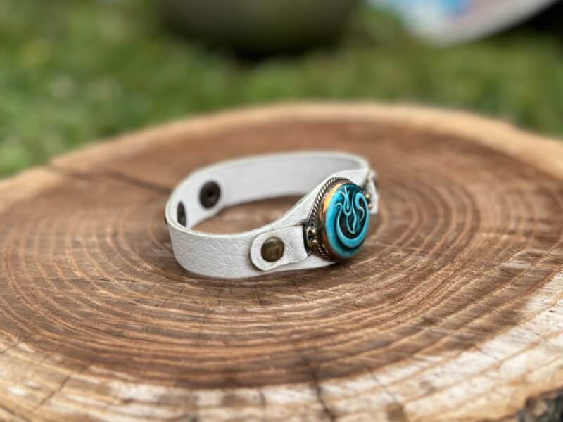 his original bracelet brings together the Tulip and Vav letters, among the most beautiful symbols of Islamic art, on turquoise Iznik ceramic. The Tulip represents the unity of God and the beauty of creation, while the Vav letter reflects the meaning “There is no deity but God”. This bracelet offers mystical elegance by artistically uniting these profound meanings. The bronze embellishments around the ceramic enrich this meaningful design, enhancing the piece’s visual appeal.